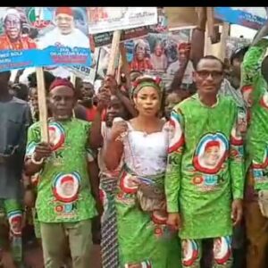The jubilant supporters of Kalu were seen chanting the names of the APC candidates and fully dressed with materials bearing the face of the Abia North Senator.