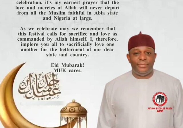 The Governorship candidate of the Action Peoples Party for the 2023 gubernatorial election in Abia state, Hon. Mascot Uzor Kalu has felicitated with all the Muslim faithful in Abia State and Nigeria at large on the occasion of this year’s…